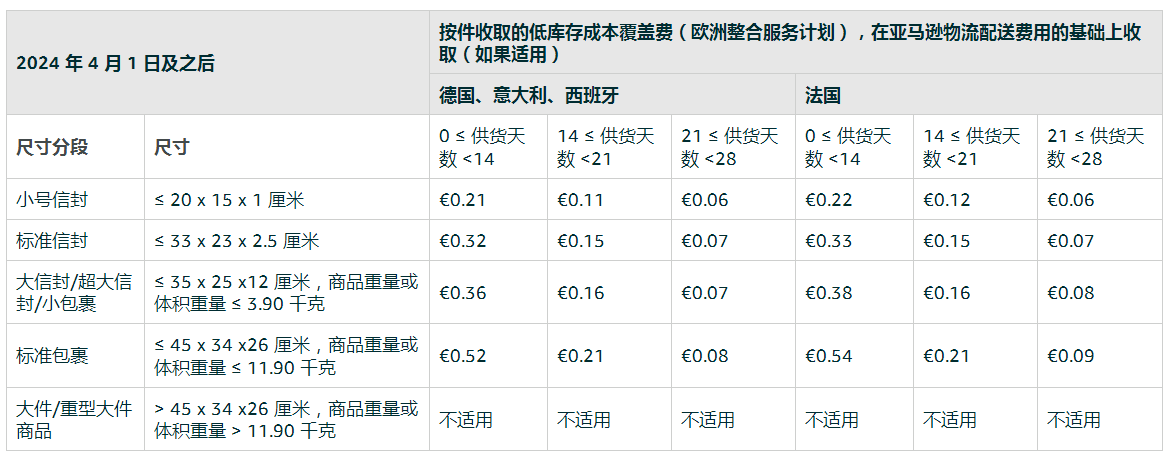 自2024年4月1日起,針對(duì)通過(guò)亞馬遜物流歐洲整合服務(wù)(Pan-EU)計(jì)劃配送的標(biāo)準(zhǔn)尺寸商品,假如德國(guó)、法國(guó)、意大利和西班牙商城的庫(kù)存商品數(shù)量相較于已發(fā)貨商品數(shù)量低過(guò)28天,亞馬遜將收取低庫(kù)存成本覆蓋費(fèi)。