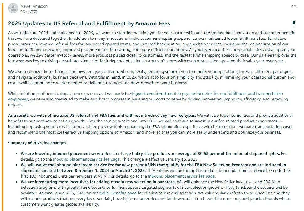 就在賣家們對亞馬遜的高昂費用感覺到無奈之際,亞馬遜突然宣布了2025年的新政,表明2025年將不會提高美國銷售傭金和