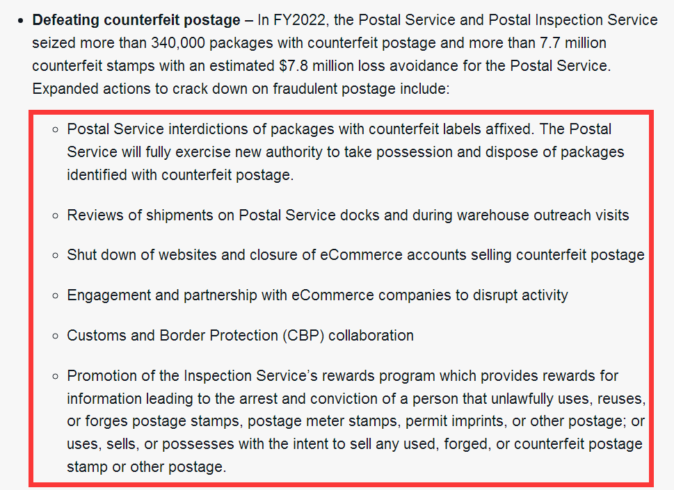 在假面單方面,2022財年,郵政管理局和郵政檢查局破獲了超出34萬個帶有虛假面單的包裹和超出770萬張偽造郵票,預估為郵政管理局規避了780萬美元的損失。